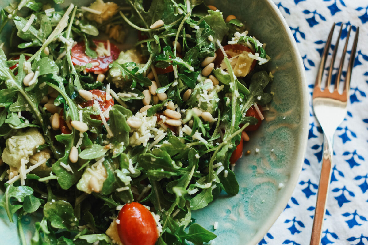 Let me introduce you to the easiest salad recipe that you’ll make on repeat this summer. All you need is lemon juice, olive oil, and a little salt for the dressing! This is the best side salad but I often throw in grilled chicken to make it a meal. All you need is some arugula, parmesan, avocado and some pine nuts. I add in a little sliced cherry tomato. For a single serving: 1 handful arugula 1/4 cup shredded...