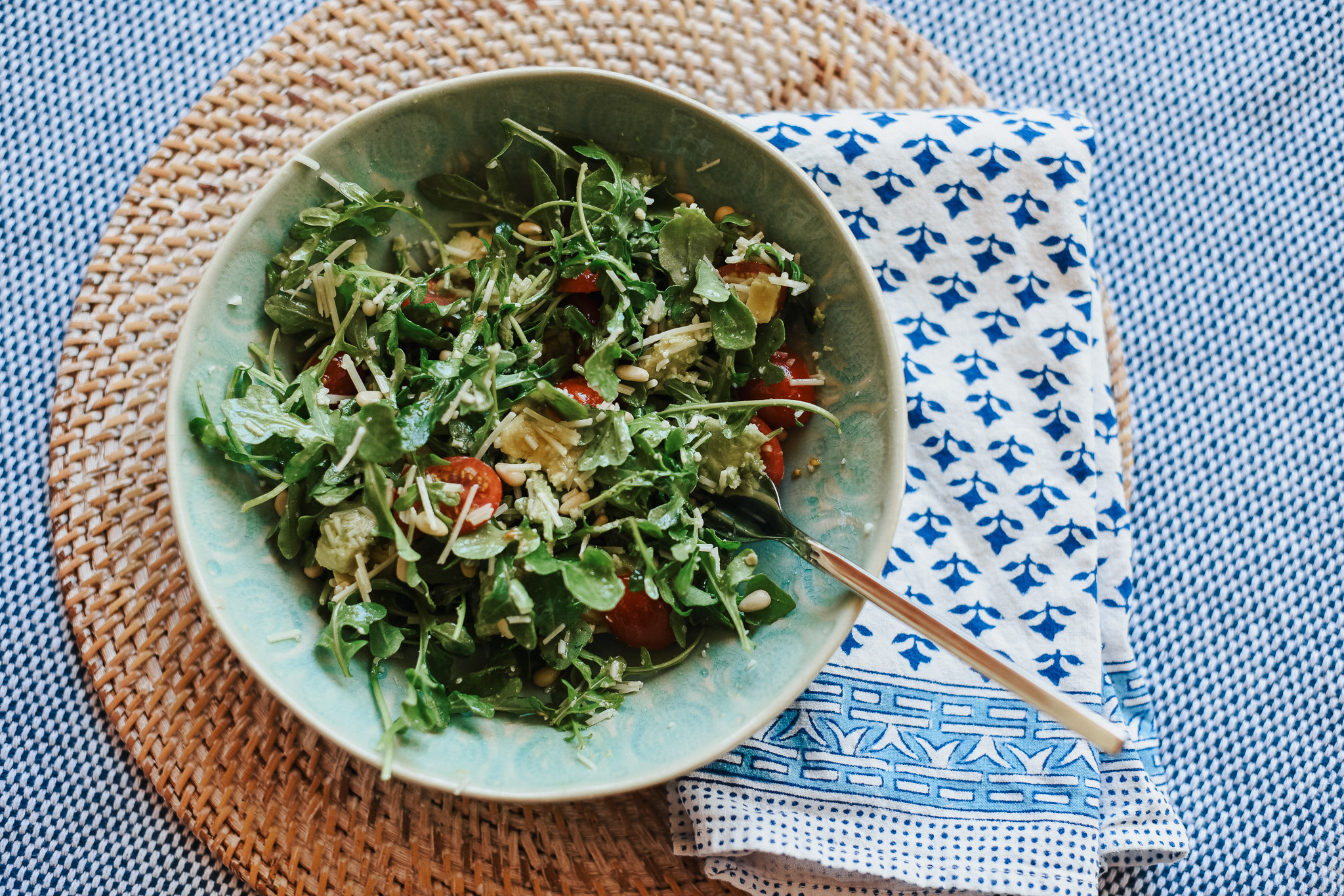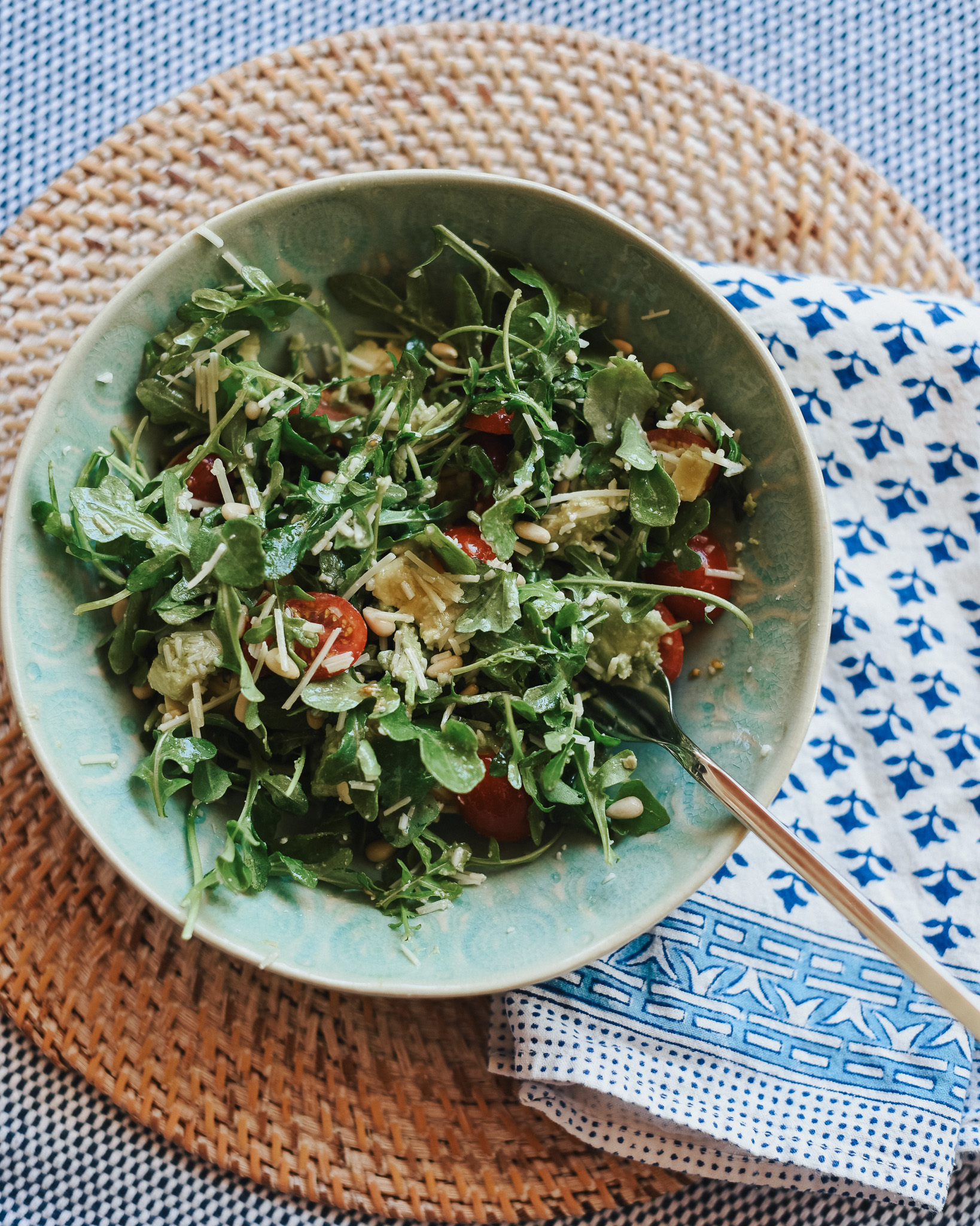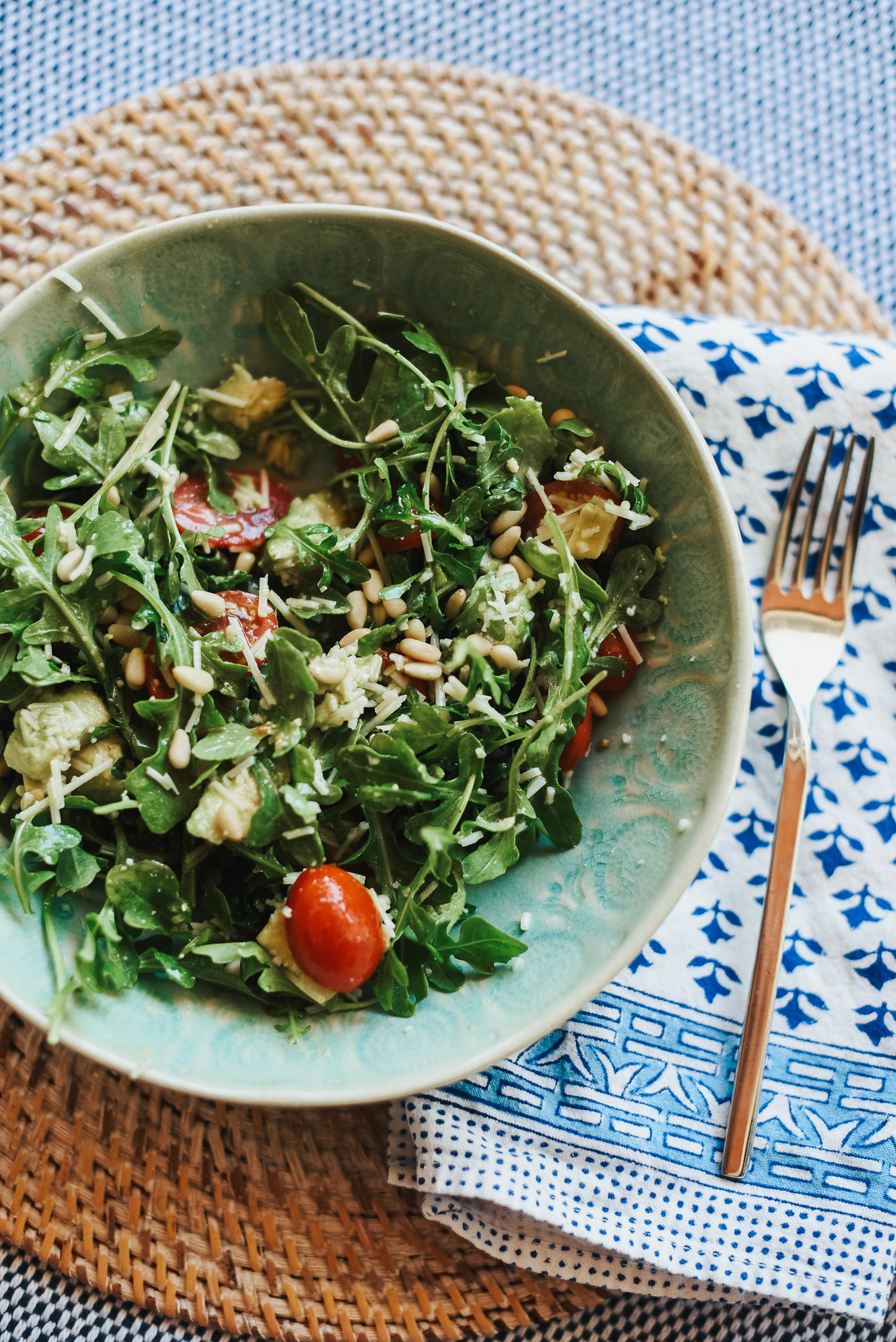 All you need is some arugula, parmesan, avocado and some pine nuts. I add in a little sliced cherry tomato.